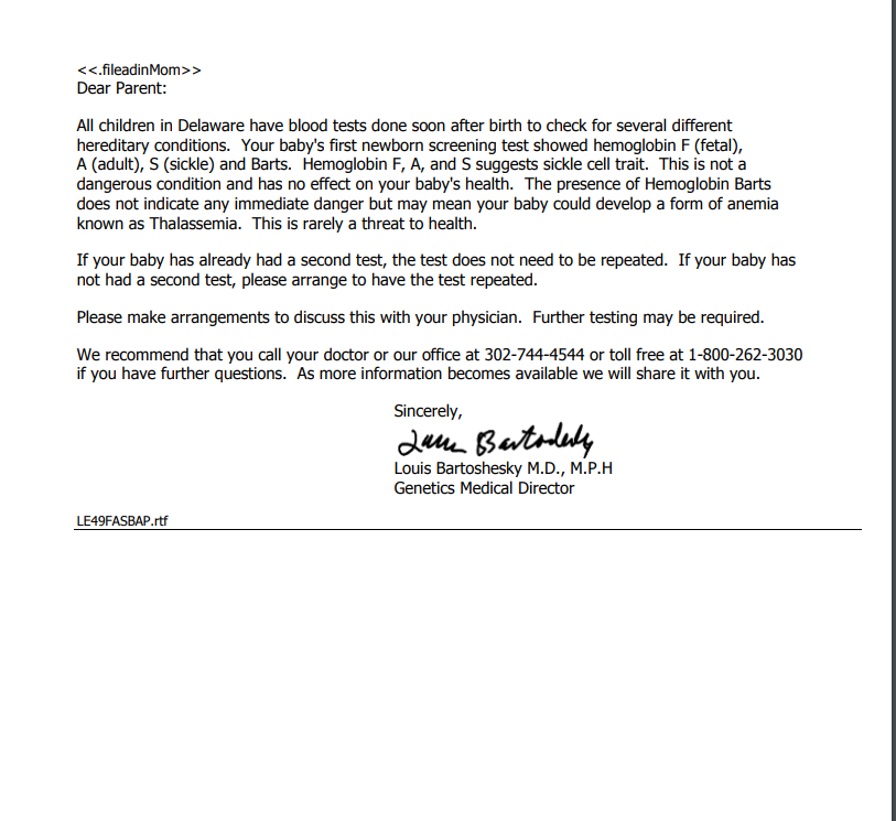 Sample Parent Letter: Hemoglobin Barts Date: August 2016 This is a sample parent letter for Hemoglobin Barts. Download Tags Follow-Up Quality Improvement Educational Tools Share