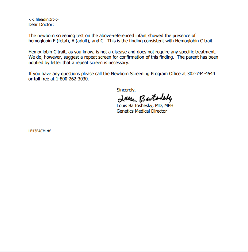Sample Physician Letter: Hemoglobin C Trait Date: August 2016 This is a sample physician letter for Hemoglobin C trait. Download Tags Follow-Up Quality Improvement Educational Tools Share
